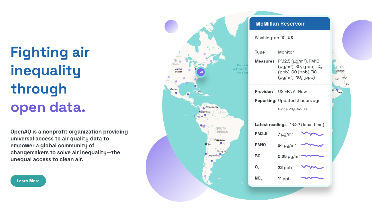 OpenAQ Worked with the CEO and CTO to develop the next generation of their core product, which provided open-source, real-time global air quality data through an interactive map and API.