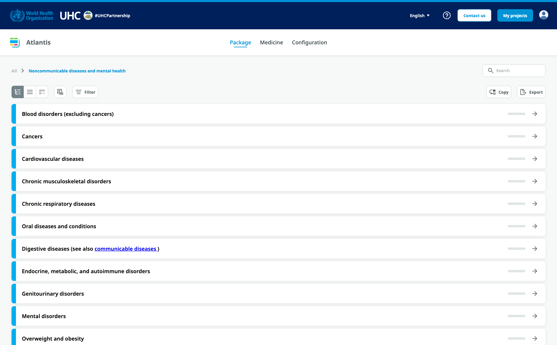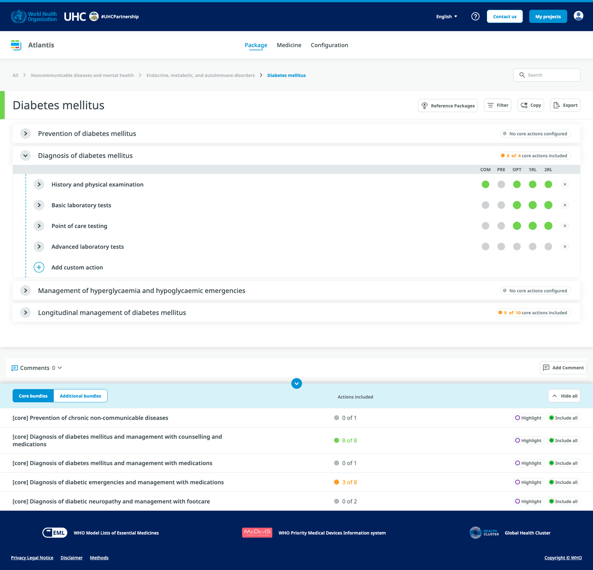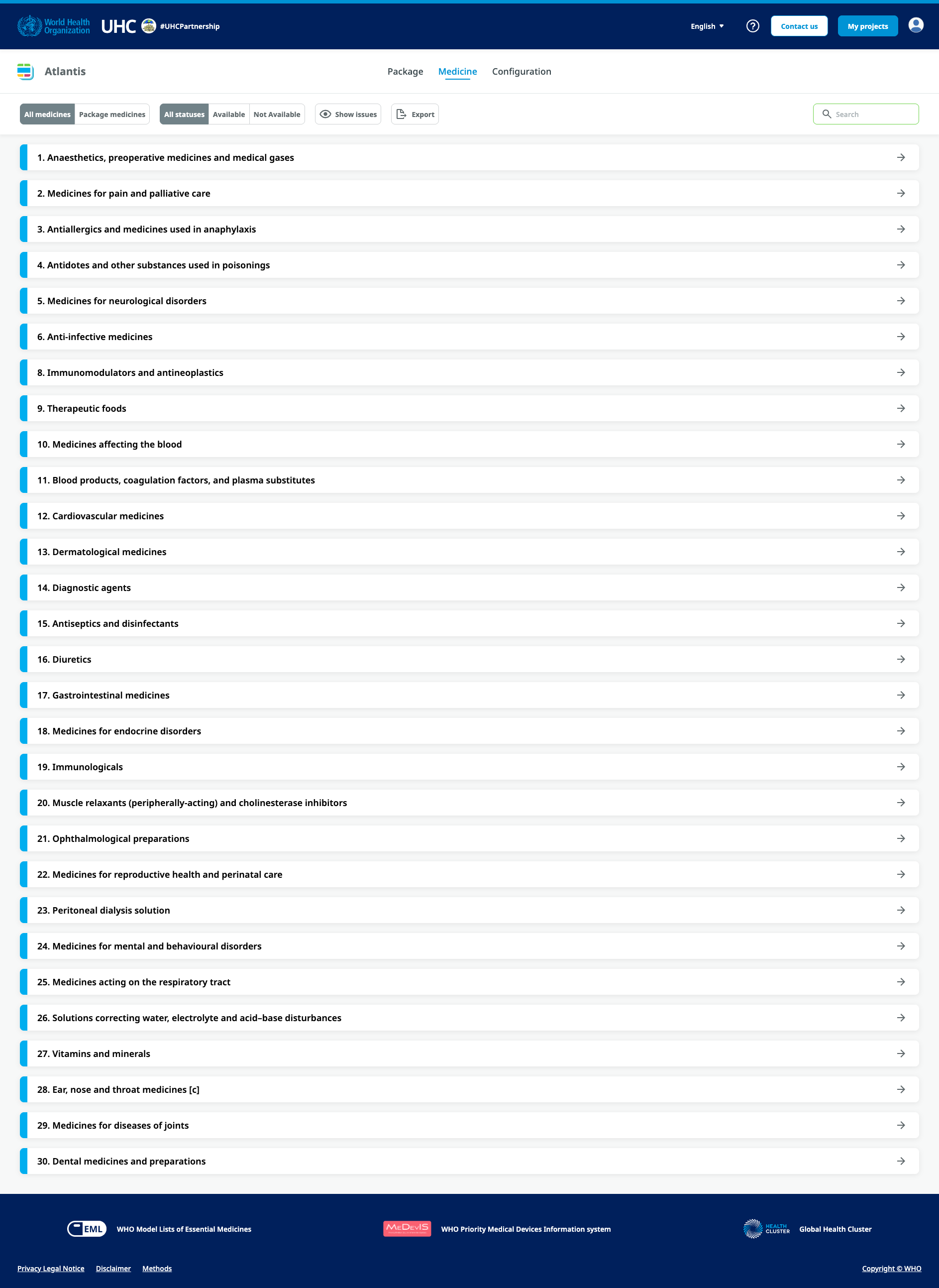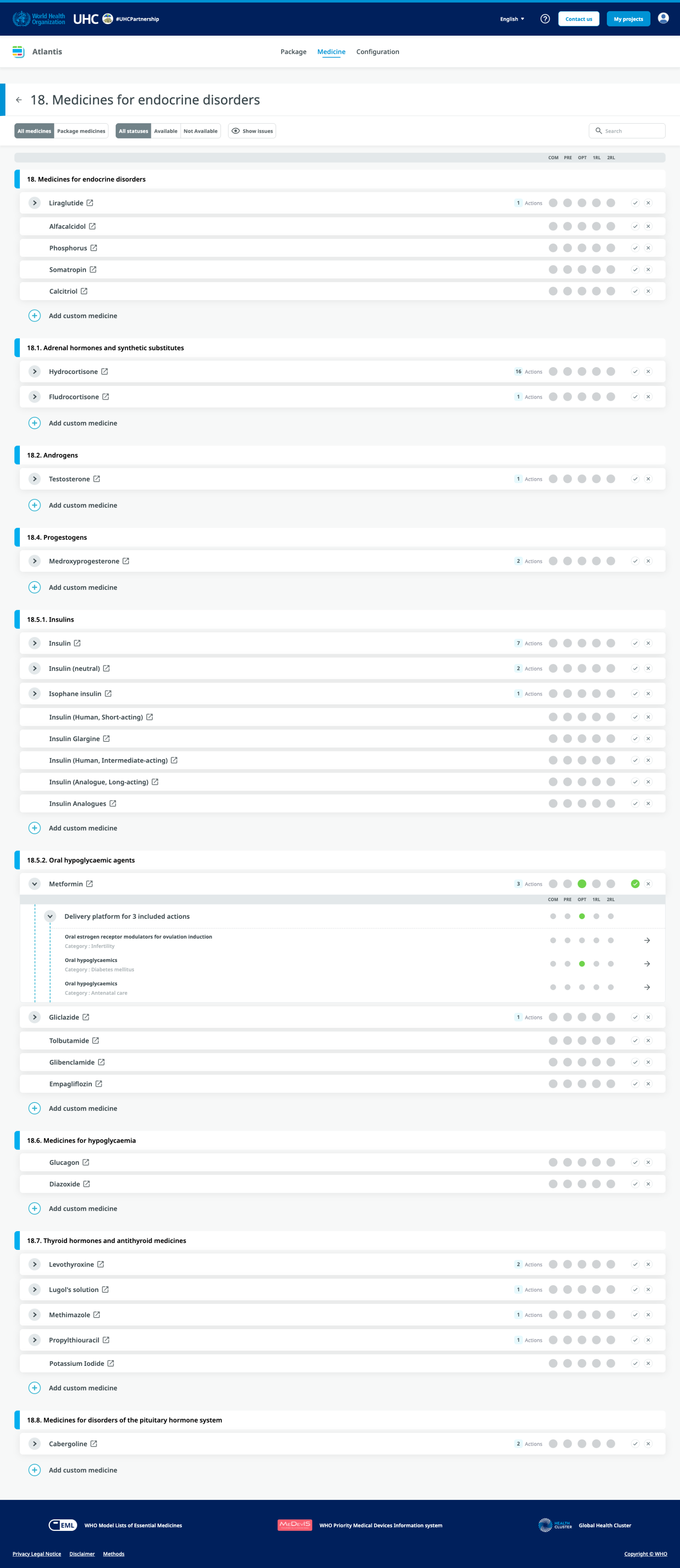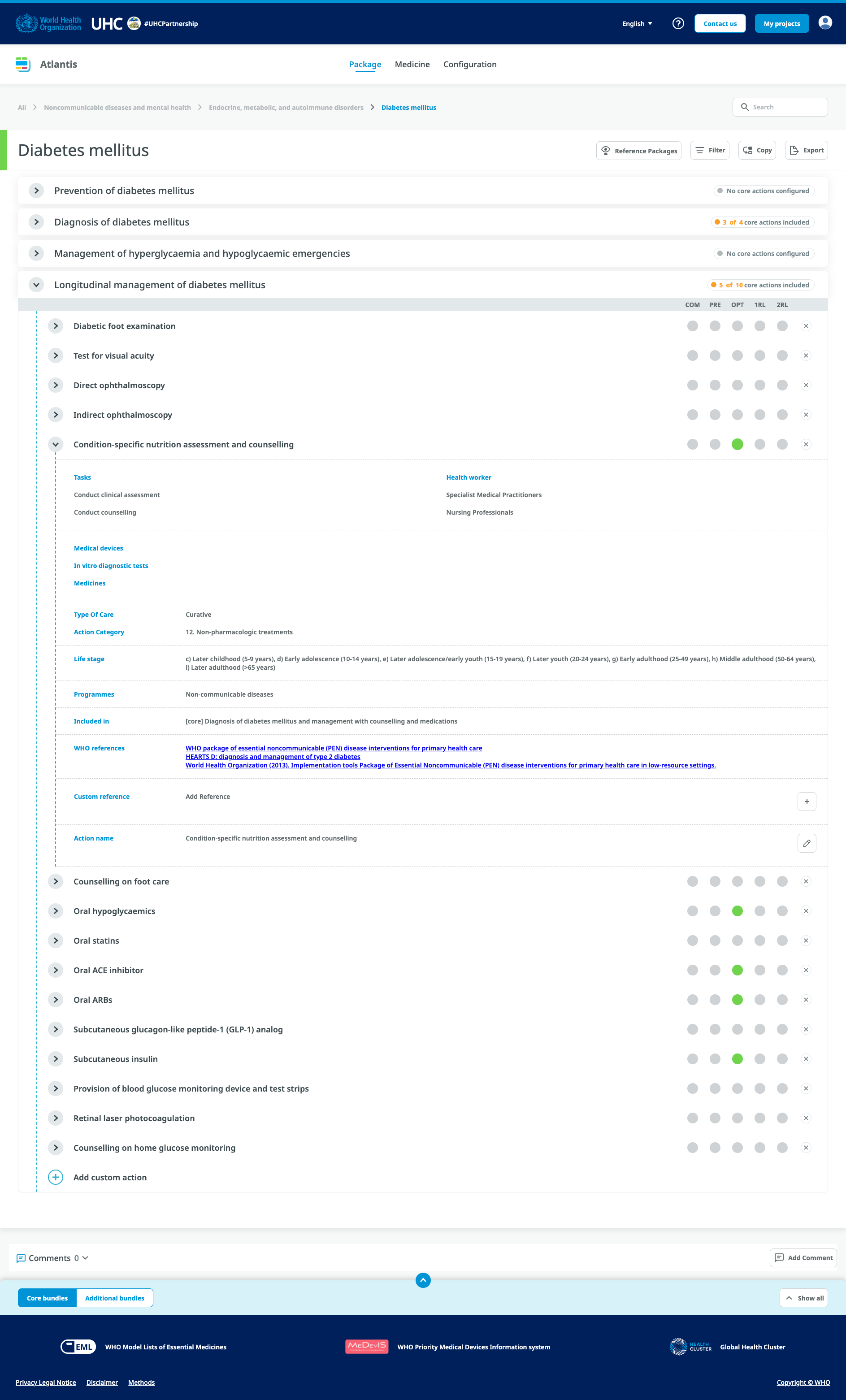The UHC Compendium is a database of health services and intersectoral interventions designed to assist countries in making progress toward Universal Health Coverage (UHC). It provides a strategic way to organize and present information and creates a framework to think about health services and health interventions. The database for the Compendium spans the full spectrum of promotive, preventive, diagnostic, resuscitative, curative, rehabilitative, and palliative services, as well as a full complement of intersectoral interventions. The Compendium provides rapid, one-stop access to supporting evidence, associated human and material resource inputs, and feedback on cost impact as interventions are selected.